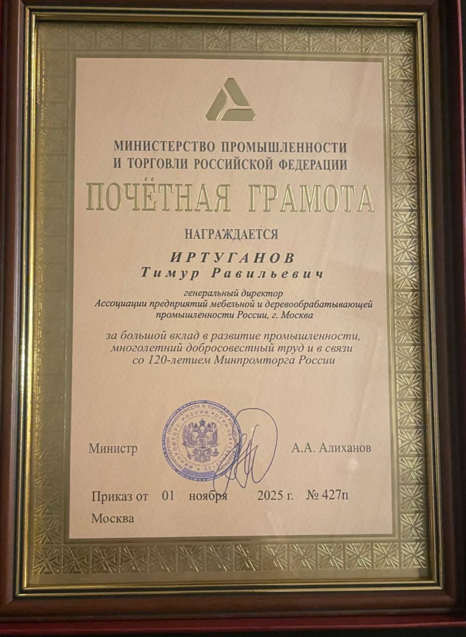 Министерство промышленности и торговли РФ наградило генерального директора Ассоциации предприятий мебельной и деревообрабатывающей промышленности России Тимура Иртуганова почётной грамотой - за вклад в развитие промышленности и многолетний добросовестный труд.